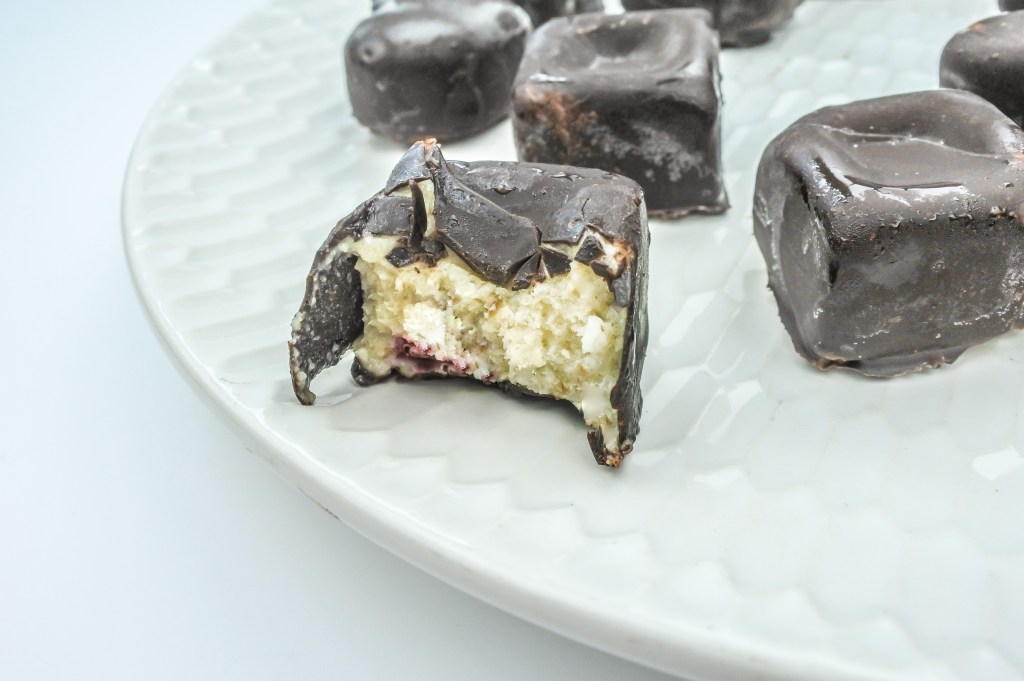 Die Schokoladenglasur habe ich ungesüßt gelassen, weil die Creme der Pralinen süß genug ist.