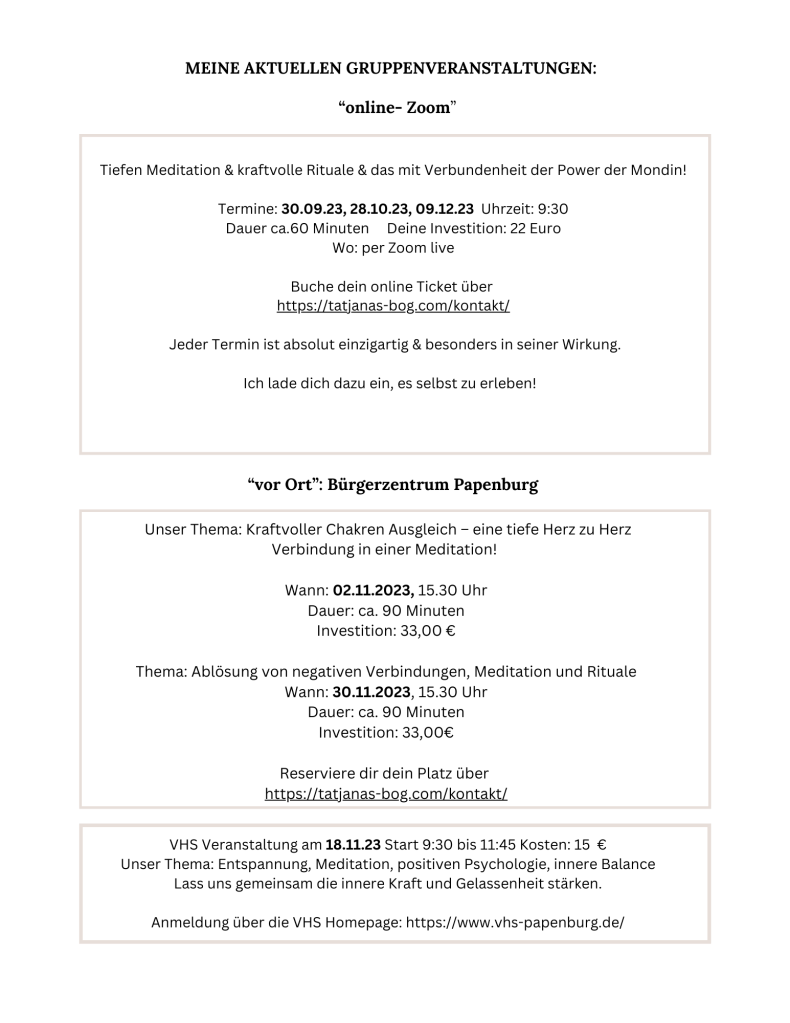 Wenn du die unvergesslich schöne Verbindung auch „vor Ort“ erleben willst, dann lade ich dich dazu ein bei diesen Events (siehe Bild unter dem Text) unbedingt dabei zu sein.